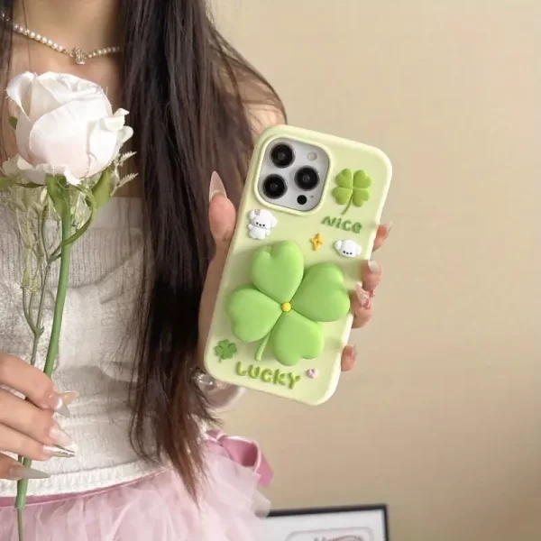 “Little fresh lucky four-leaf clover stand silicone phone case for iPhone 15/16 max/plus, featuring flowers, elegant, protective, cute, Japanese style, sweet, protective cover, suitable for ladies.”