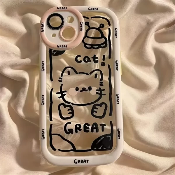 Cream shell IND black line kitten phone case for Apple 15 16 promax