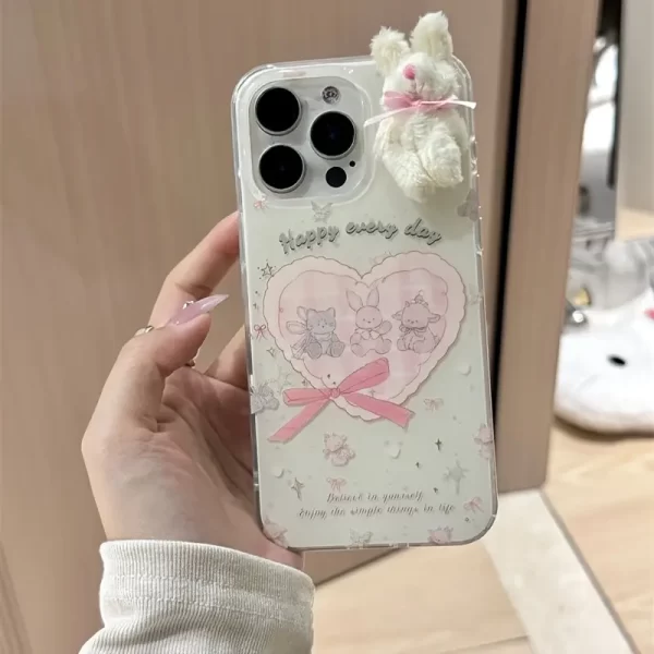 Crystal clear white heart-shaped butterfly rabbit cat phone case with plush bowknot rabbit doll, suitable for iPhone 15 16 Pro Max