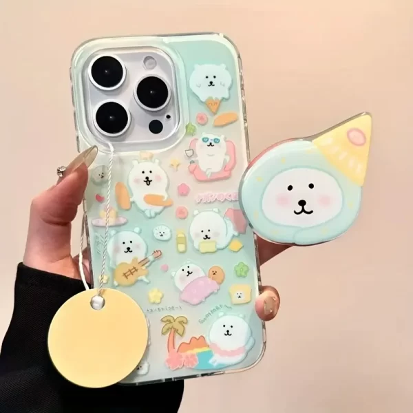 Crystal transparent white light full screen small animal phone case with bracket chain suitable for iPhone 15 16 Pro Max