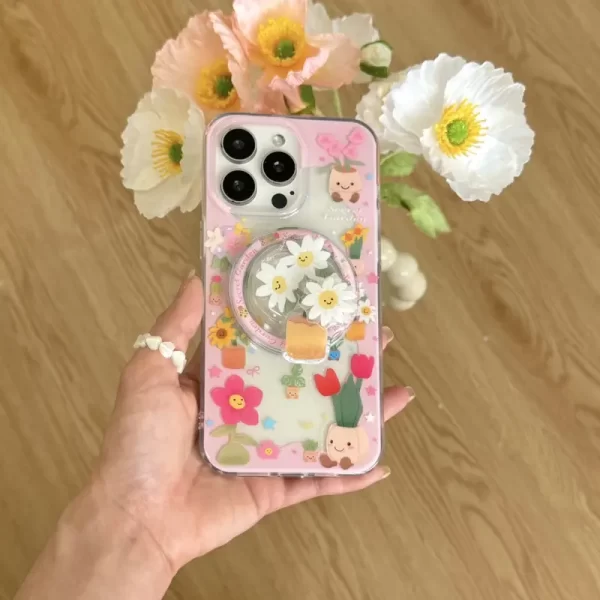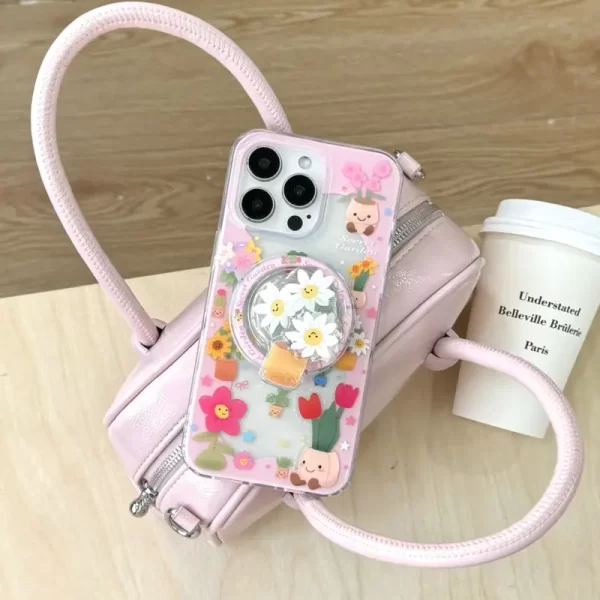 Cute and colorful potted plant rotating flower design, compatible with iPhone 16 Promax, double-layer iPhone 15 Pro magnetic stand, Promax/15/16 series phone case protective cover
