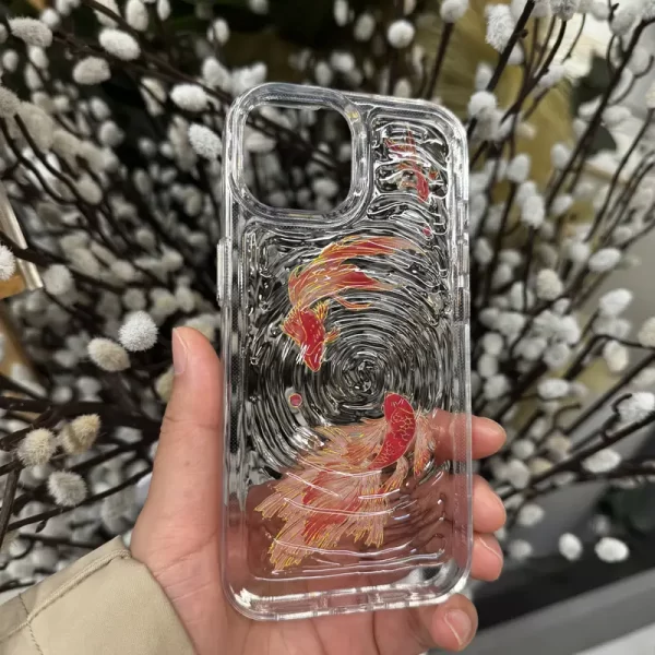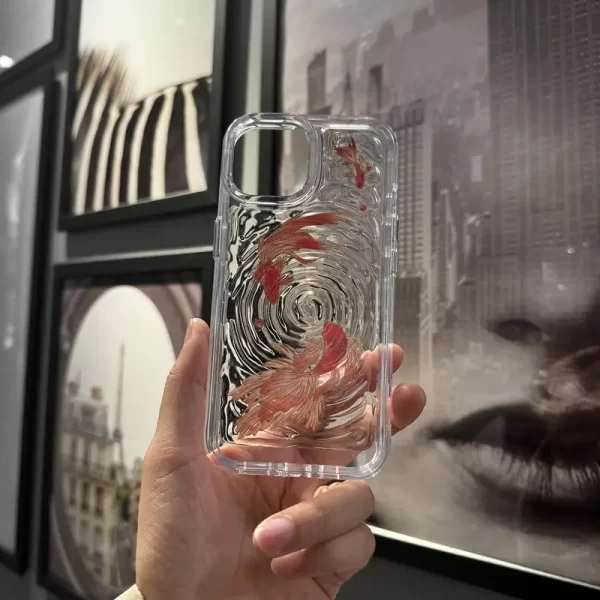 Handmade iPhone 15/16 Pro Max phone case with lucky koi water ripple pattern, fresh and transparent Ins style, luxurious texture, camera protection, fashionable phone case, trendy phone accessories, unique design, advanced materials, durable phone case, designer phone case, protective case, creative personality, luxury pursuer