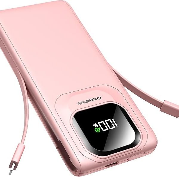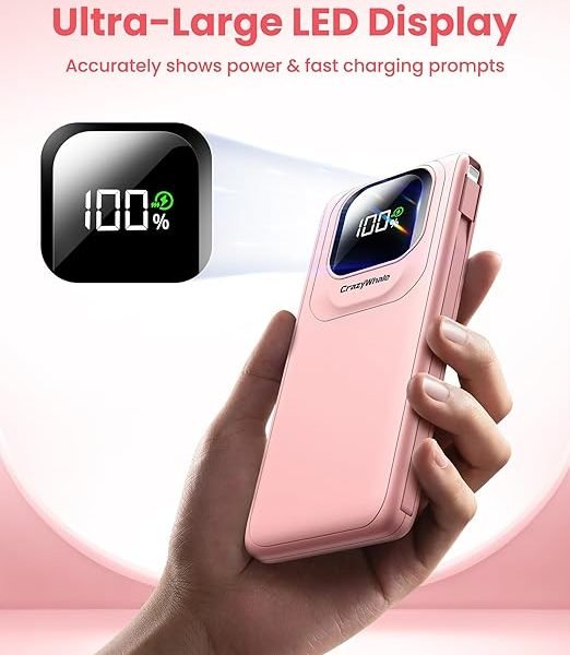 Portable Charger Power Bank with Built-in Cables, 22.5W Fast Charging 10000mAh Phone Charger, Travel Battery Pack Slim Battery Bank with Smart LED Display for iPhone, Android & USB-C Devices (Pink)