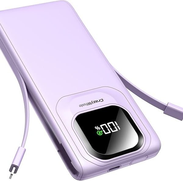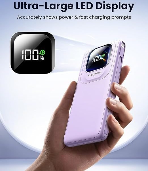 Portable Charger Power Bank with Built-in Cables, 22.5W Fast Charging 10000mAh Phone Charger, Travel Battery Pack Slim Battery Bank with Smart LED Display for iPhone, Android & USB-C Devices (Purple)