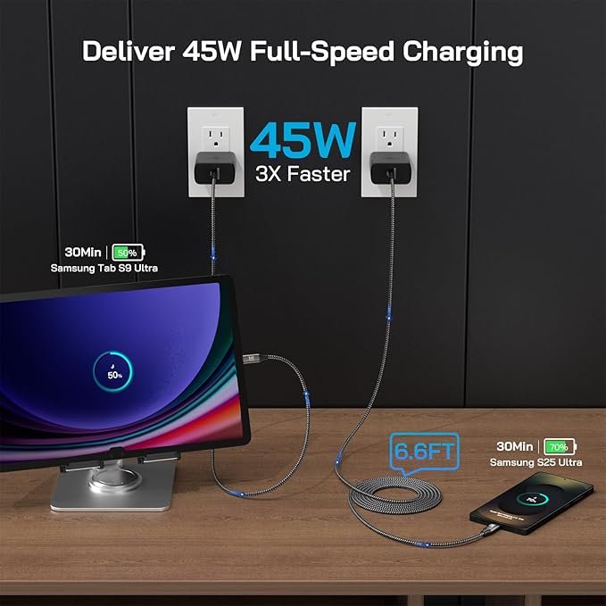 - ćOne Fits Allć- This portable 45W USB-C Charger pack broadly fits almost any personal devices from phones, tablets to laptops, and especially, provides optimized charging for Samsung, [45W Super Fast Charging 2.0]: for Samsung Galaxy S25 Ultra/S25+/S24 Ultra/S24+/S23 Ultra/S23+/S22 Ultra/S22 Plus/S20 Ultra/Note 10+, Galaxy Tab S8/Ultra; [25W Super Fast Charging 1.0]: for Samsung Galaxy S25/S24/S23/S22/S21+/S21 Ultra/FE/S20+; [PD Fast Charging]: Mac Book, i Pad, i Phone, Switch, for Steam Deck..
