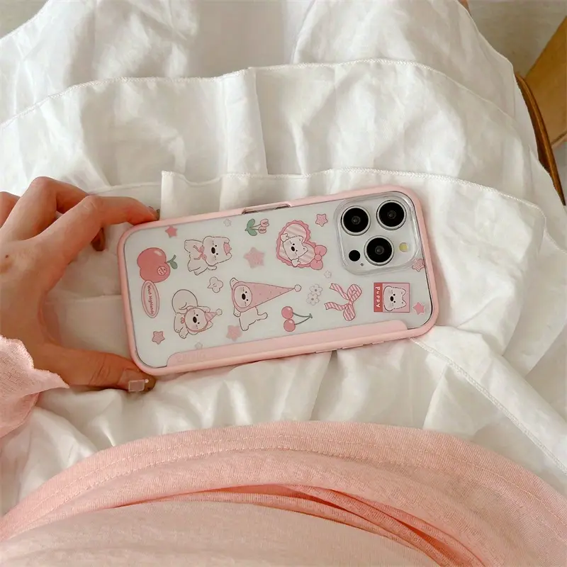 A pink puppy wearing a birthday hat phone case, specifically designed for iPhone 16 Promax/16/15/15 Promax, featuring shockproof and drop-resistant protection, cute and creative design, stand function, and transparent