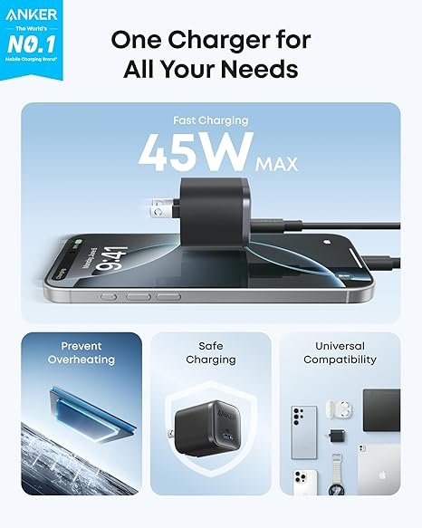 Anker Nano 45W Type C Charger Fast Charging, Compact and Foldable Plug USB C Charger Block for iPhone 16 Series, MacBook, Pixel 9, iPad, Samsung Galaxy S25 Ultra / S24 Series (6 ft Cable Included)