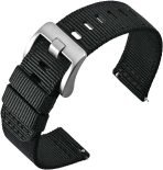 - Premium Materials: This watch band is made of tightly weave nylon fabric, double layer (2.2mm), very durable, comfortable and breathable, fabric is waterproof, fully washable. Heavy-duty stainless-steel buckle in a brushed finish