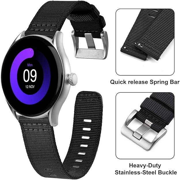 - Military Look: Traditional one piece nylon straps go under the back of a watch, and prevent the smartwatch’s sensors from working properly. Our two piece nylon straps feature classic military styling while leaving the back of the watch clear so it functions properly