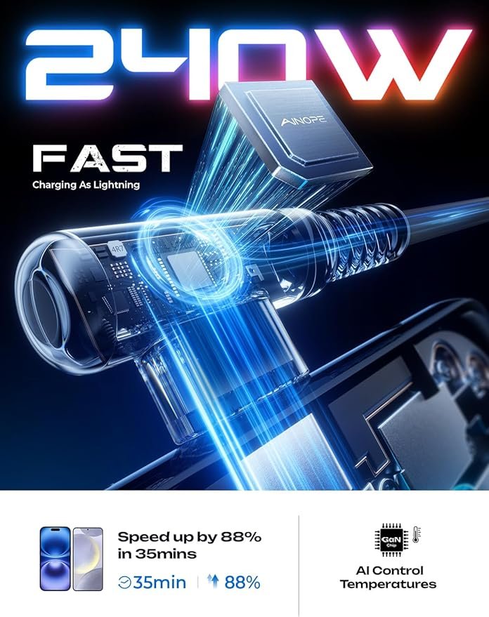- ć240W iPhone 15 usb c charger cable Blast Past Fastest Chargingć AINOPE 240W 100W fast charger type c to type c cable is a fully upgraded new version that combines the most advanced and useful features available: elbow port, 100W super fast charger and A/C adapter, a usb c cable that can meet all charging scenarios such as macbook pro fast charging, samsung fast charging, iPad mini 7 iPad Pro fast charging and other USB A devices.