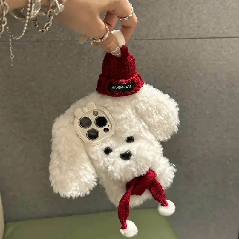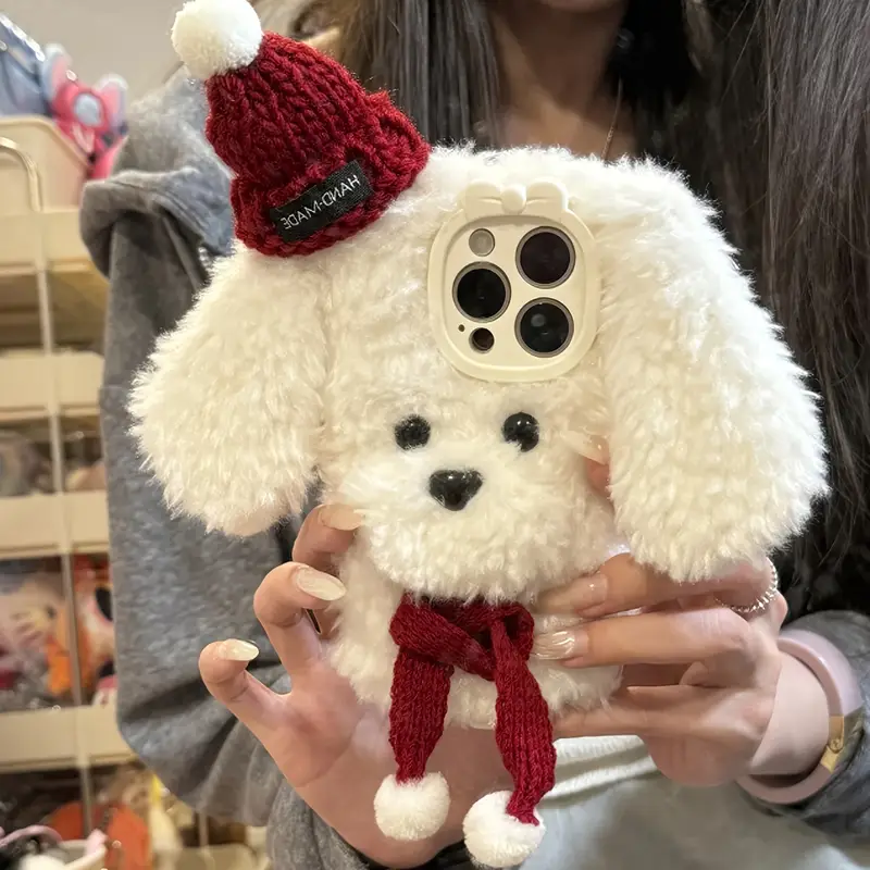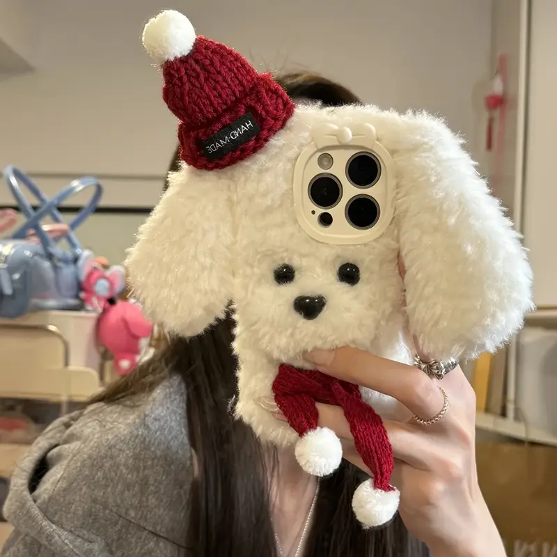 Autumn/Winter 3D Scarf Knitted Hat Dog Plush Phone Case Suitable for iPhone 16 Pro Max