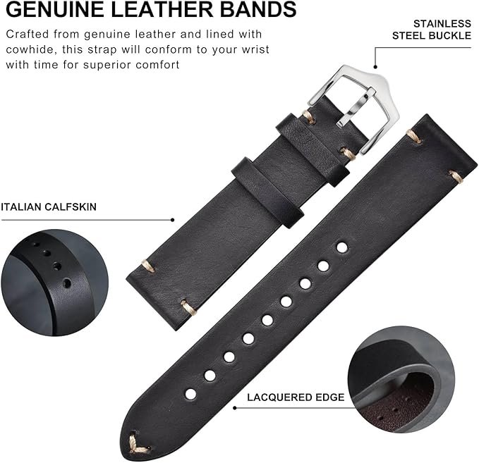 - Italian Calfskin: Toffee Brown, Coffee Brown and Black watch straps are made of Italian calfskin, which is durable and will conform to your wrist with time for superior comfort