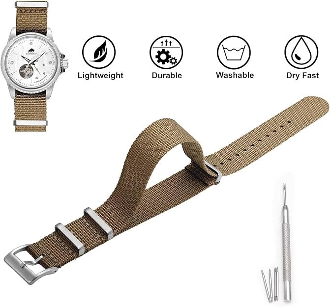 - Watch Band Material: This watch strap is made of high-quality nylon, which has good elasticity and wear resistance in dry and wet conditions. Features Comfortable, durable, waterproof, and washable, and quick-drying. The buckle is made of 304 stainless steel, solid and sturdy