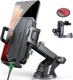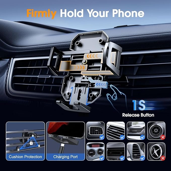 - [Easy One-Hand Operation] Enjoy effortless one-touch phone release and locking within seconds – perfect for safe driving. With its adjustable clamps and expanded grip range, this car phone mount for iPhone securely fits most smartphones from 4.0″ to 7.0″.