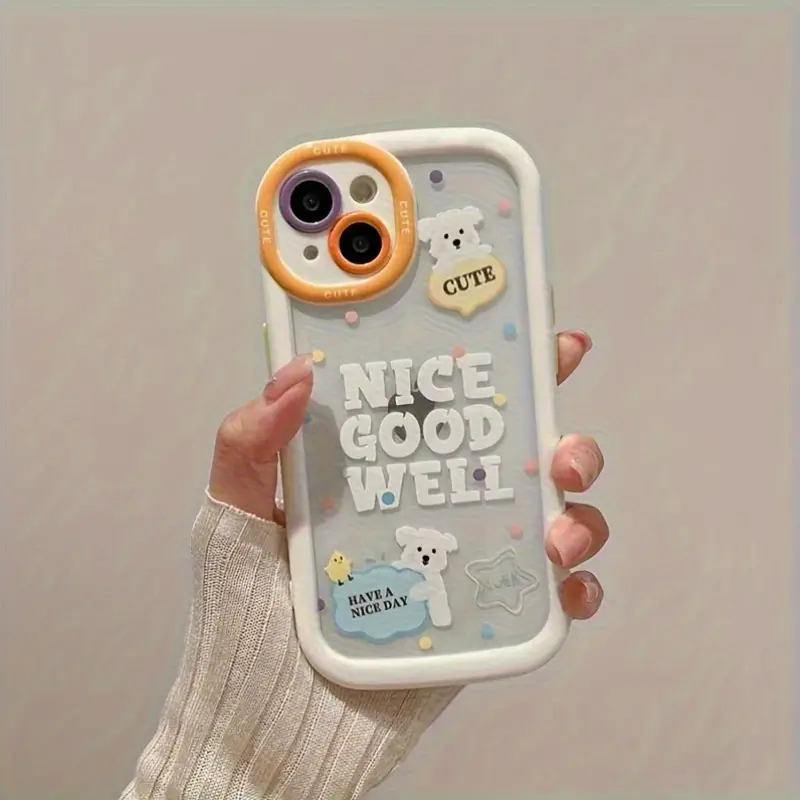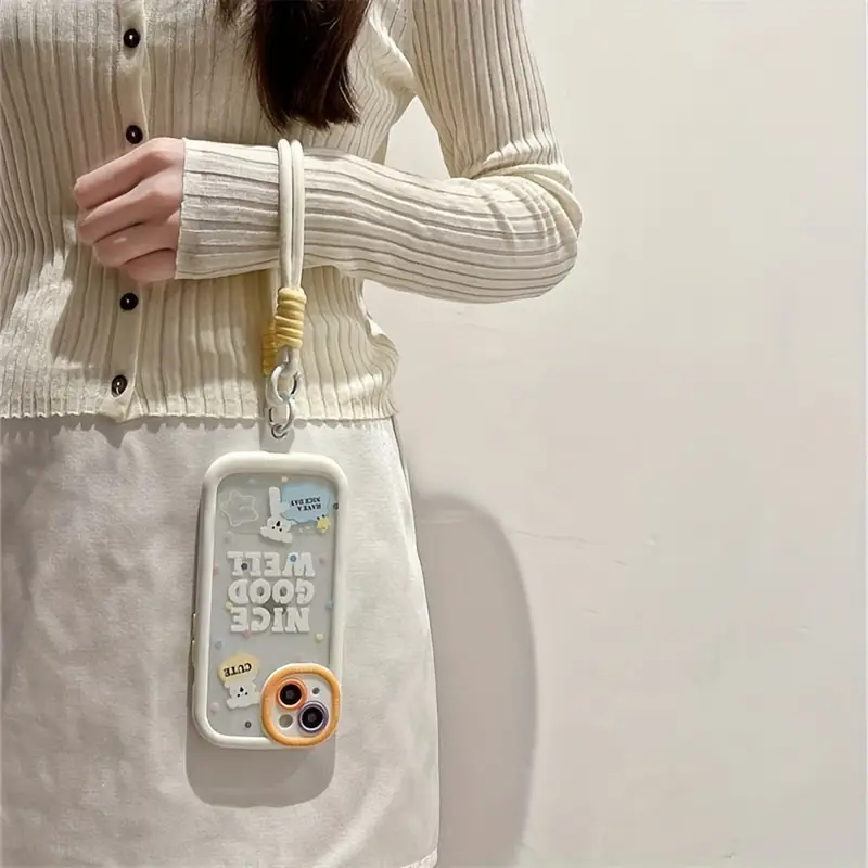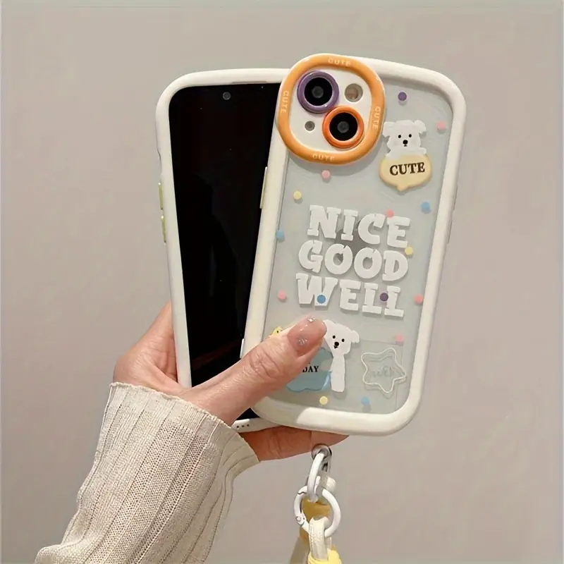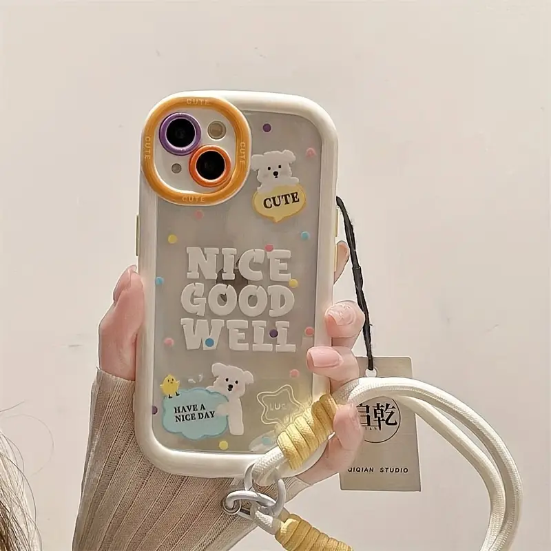 Cream shell painted colorful polka dot puppy phone case with same color phone lanyard suitable for Apple 15 16 Pro Max