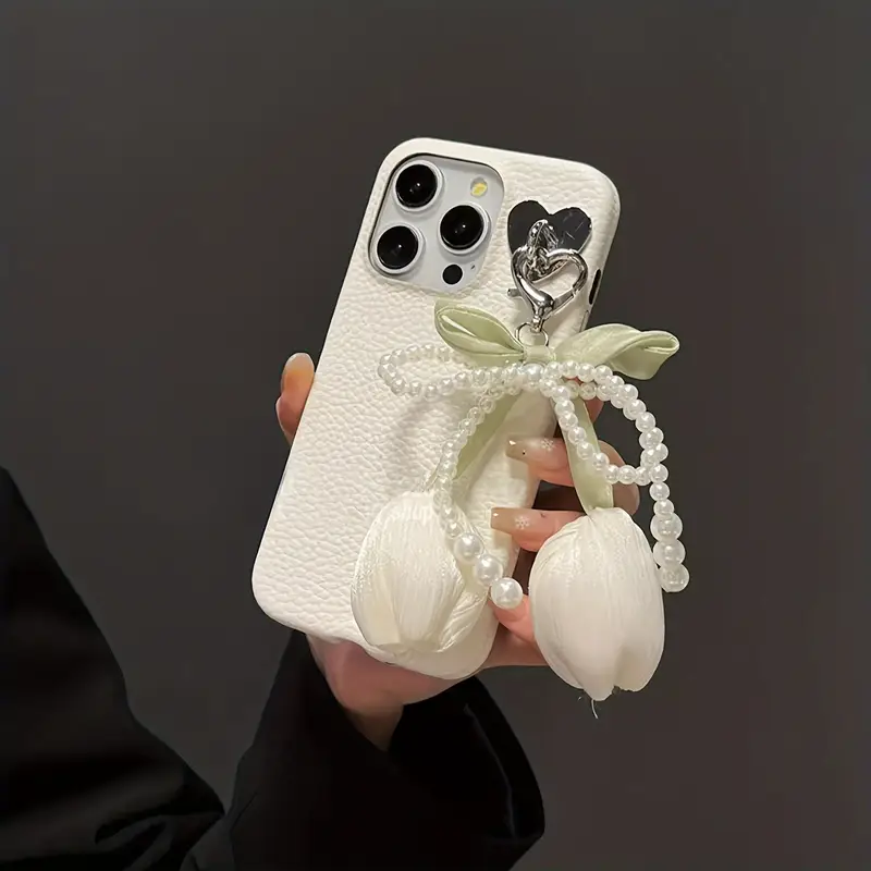 Elegant white litchi pattern phone case, adorned with bowknot and tulip pendant, suitable for iPhone 15 Pro Max – fashionable and high-end protective cover for women’s phones
