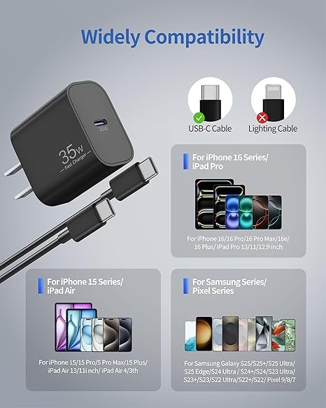 - Widely Compatibility: 35W USB C Fast wall charger for iPhone 16e/16/16 Plus/16 Pro/16 Pro Max/15/15 Plus/15 Pro/15 Pro Max, iPad Pro 13/12.9/11 inch, iPad Air 13/11 inch 2025 Air 5th, iPad 11th/10th Generation, iPad Mini 7th/6th, AirPods, and also fast charge for Samsung Galaxy S25/S24/S23/S22 Ultra, Google Pixel 9/8/7/6/5, LG, Moto, Tablets, Android Phones and more
