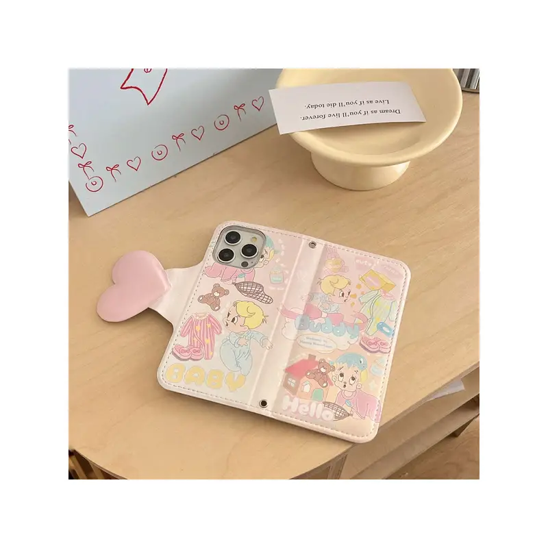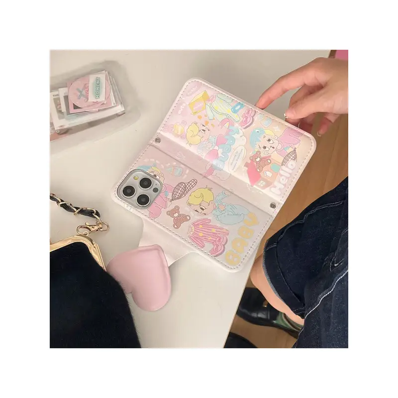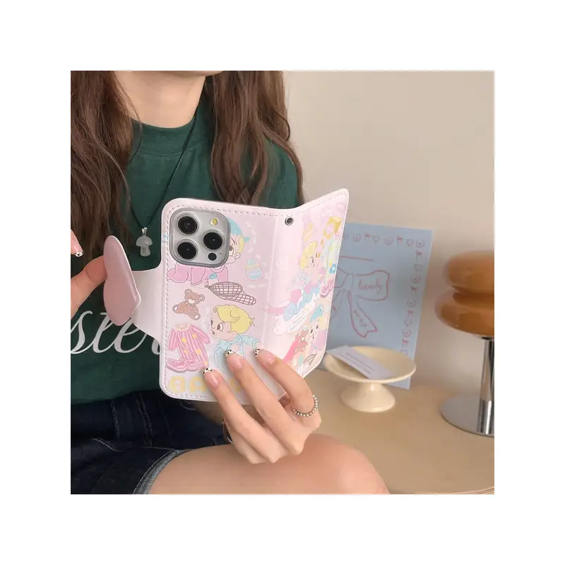 Fully-covered flip leather magnetic card holder children’s illustration phone case for iPhone 16 Pro Max/iPhone 15 Pro Max