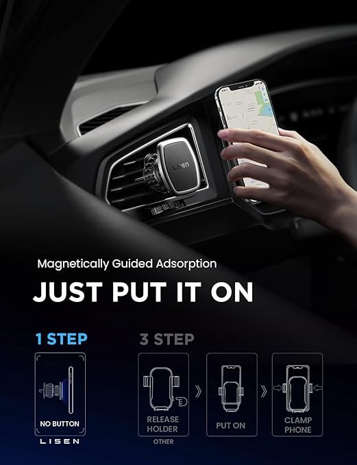 - CONVINCING QUALITY & UNIVERSAL COMPATIBILITY: LISEN car phone holder won SGS RoHS & SGS CP65 official certification and passed the magnetic force, telephone signal, hook stability and ingredient safety test. Quality is strictly controlled. The car holder holds most smartphones and mini tablets compatible with iPhone 15 14 13 12 11 pro max / XR / X / 8/7/6/5, Note 9 / Galaxy Note20 U, S24 S23 S22 S21 S20 S10 S9 S8 S7 S6, iPad Air 2 / Mini 3 / Pro 9.7 and more.