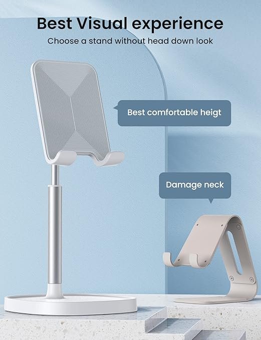 - TALLER AND MORE PHOTOGENIC STAND, HELP TO CORRECT THE “TEXT NECK”: This cell phone stand holder is in accordance ith ergonomic design.Desk organizers and accessories Providing you comfortable viewing angle which helps to fix your posture and reduce neck & back strain. The height can be easily adjusted between 7.1in-8.5in(1.4in adjustable range), the angle is adjustable between 5°~85°