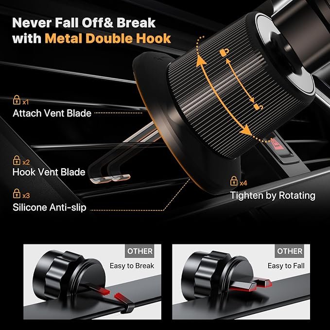 - Never Fall Off-Metal Hook Design: Miracase car phone holder adopts simplified locking design. The steel metal hook(with silicone pad and mat) will catch one of car air vent blades and provide excellent strudiness. It will work well for your car even in extremely harsh environments. NOTE: ONLY Compatible with horizontal and vertical vents. Not suitable for round vents. Also can be used on bedstand and desk.