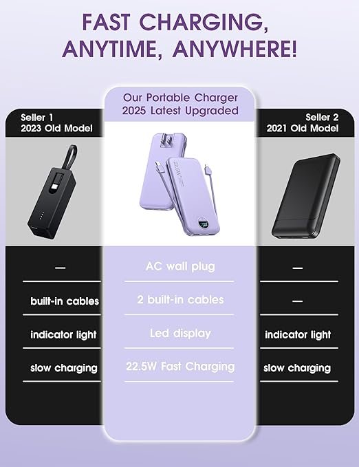Be the first to review “Portable Charger, 12000mAh 22.5W USB C Fast Charging Power Bank with Built-in Cables and AC Wall Plug, Smart LED Display Travel Essentials Battery Pack Compatible with iPhone, iPad, Samsung etc Purple” Cancel reply