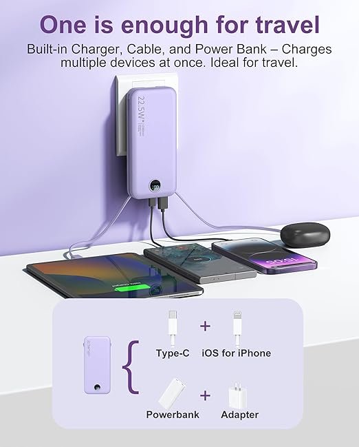 Portable Charger, 12000mAh 22.5W USB C Fast Charging Power Bank with Built-in Cables and AC Wall Plug, Smart LED Display Travel Essentials Battery Pack Compatible with iPhone, iPad, Samsung etc Purple