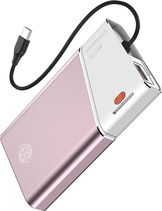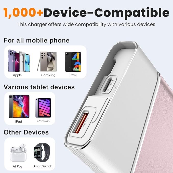 - Built-in Cable – This 20,000mAh portable charger features a built-in Type-C cable, compatible with most cellphones and laptops. This compact power bank is widely compatible with the iPhone series (iPhone, iPad, AirPods), Android devices (Samsung, Google Pixel, Realme, Oppo, Vivo, LG, Motorola), and other electronics like small fans, heating vests, and smart wearables