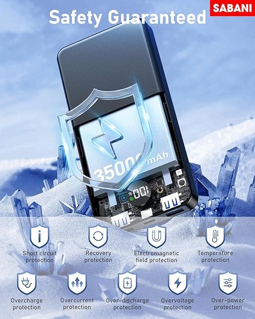 - Safe and Reliable Battery Pack: SABANI portable battery has 10 layers of multiple system protection, built-in low-temperature IC ice core, intelligent monitoring of voltage and current, actively avoid over-charge, over-discharge, short circuit, high temperature and a series of potential dangers, creating a safe charging environment for you. What You Get: 1*35000mAh Portable Charger with 4 built-in Cables and 3 Ports, 1*USB C Cable for Recharging Portable Charger, 1*User Manual.