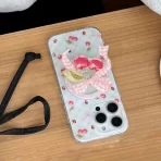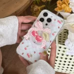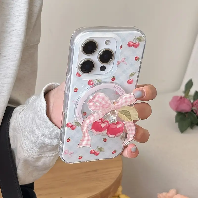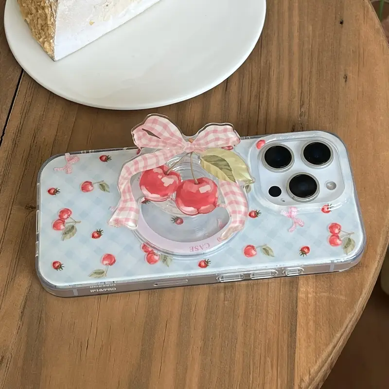 Summer cherry blue checkered phone case with stand, suitable for iPhone 16 Pro Max / 15 Pro Max. Fashionable and minimalist design, trendy protective cover for women