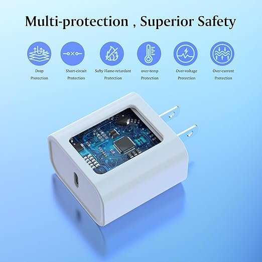- [Safety Efficient Fast Charging]: This USB C Wall Charger for iPhone owns bulit-in multi-protection system, which conforms to ETL, UL and FCC safety standard, avoiding from over-charge, over-voltage, over-heat, etc. The smart chip including in the M.Fi certified l.ightning cable match the current required by the for you device automatically, charge your iPhone/iPad device fast, safely and steadily.Tangle-free 6 Ft length is convenient for usage while charging and sync at home/ office/ travel in bed, hotel rooms, and more